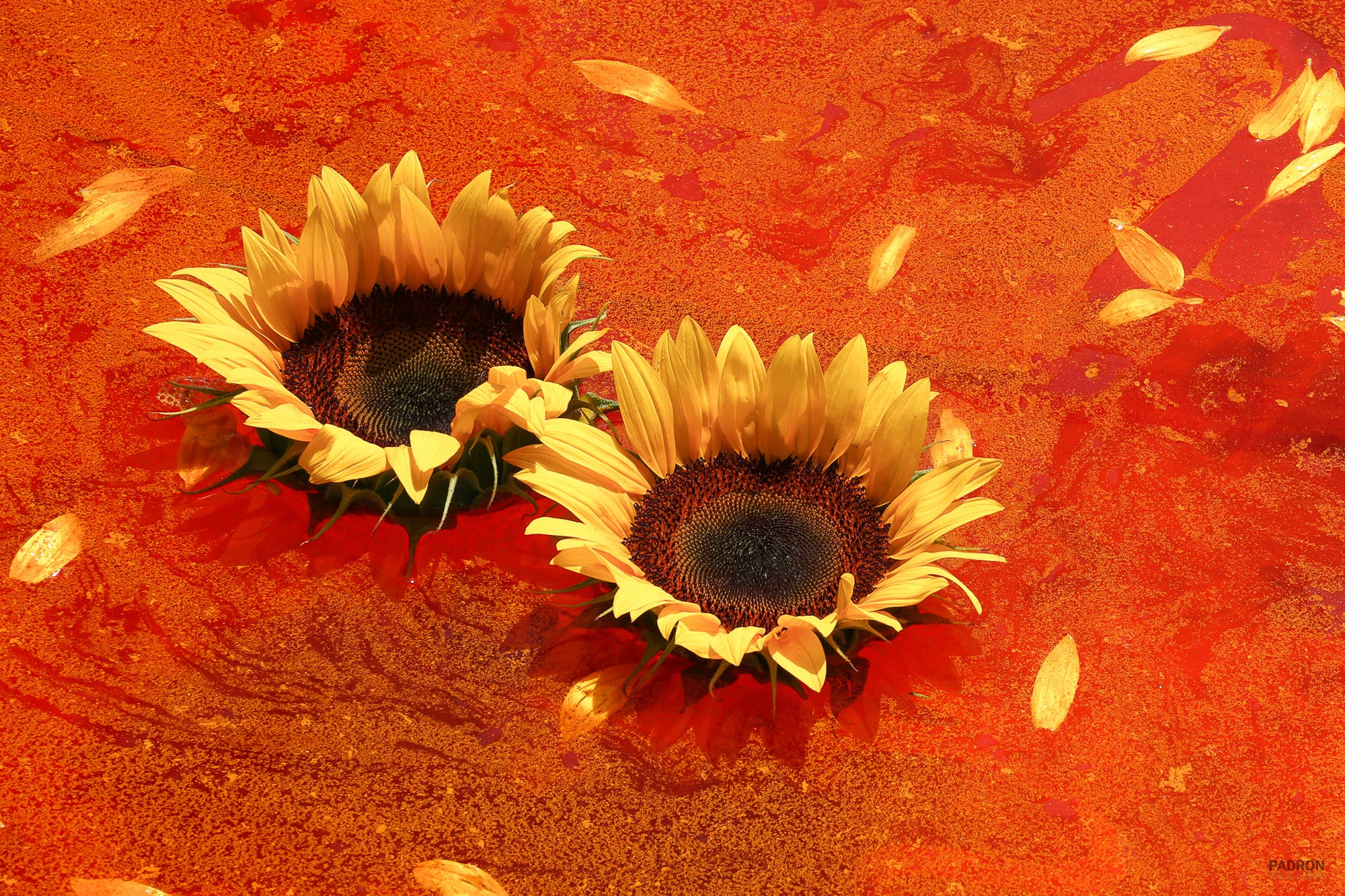 Red Sunflowers 3 distills beauty to its simplest and most symbolic form: two sunflowers floating gently on a vivid pool of red water. The stark composition draws attention to the delicate relationship between the pair — evoking themes of connection, fragility, and quiet resilience.
